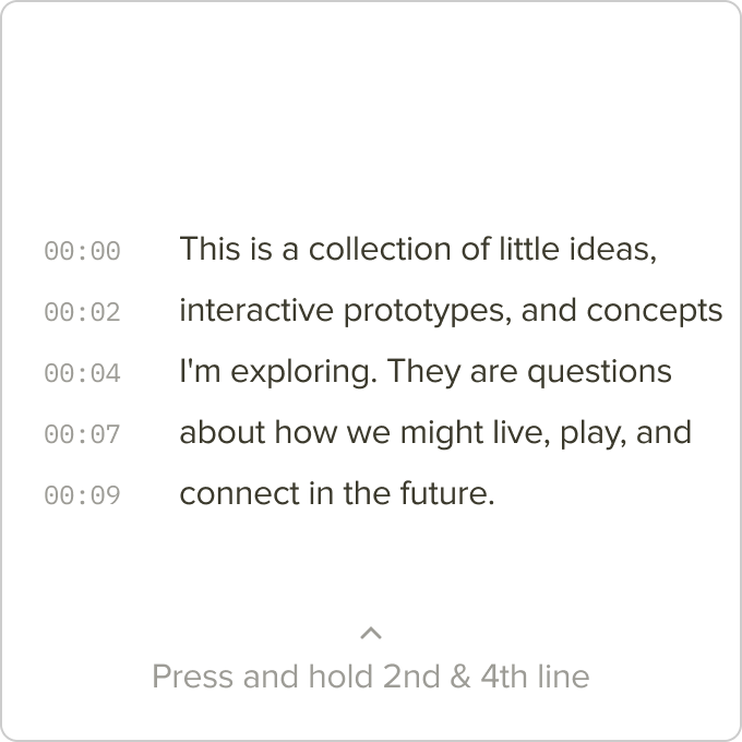 This is a collection of little ideas, interactive prototypes, and concepts I'm exploring. They are questions about how we might live, play, and connect in the future.